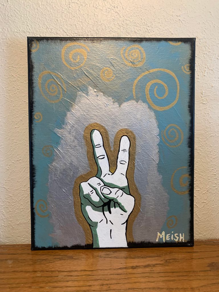Originals Posted bymadebymeishJanuary 23, 2022January 10, 2023Posted inUncategorized Email madebymeish@gmail.com for inquiries ‘Hen Feather’ 2021 Framed 8×10 Acrylic on watercolor paper $300 ‘Slow and Steady’ 2021Framed 8×10 Acrylic on watercolor paper $450 ‘Peace’ 2015 11 x 14 Acrylic on Canvas $350 Share this: Click to share on X (Opens in new window) X Click to share on Facebook (Opens in new window) Facebook Like Loading... Related